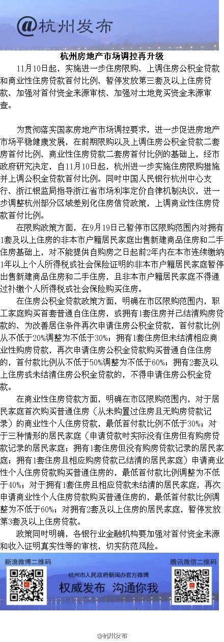 據杭州市人民政府新聞辦公室官方微博消息,昨日深夜杭州發布住房限購政策,房地產市場調控再升級。政策規定,11月10日起,杭州實施進一步住房限購、上調住房公積金貸款和商業性住房貸款首付比例、暫停發放第三套及以上住房貸款、加強對首付資金來源審核、加強對土地競買資金來源審查。