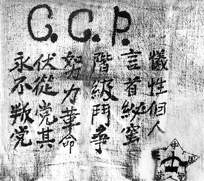 “犧性(牲)個(gè)人,言(嚴(yán))首(守)秘(注:秘錯(cuò))蜜(密),階級(jí)斗爭(zhēng),努力革命,伏(服)從(注:從錯(cuò))黨其(紀(jì)),永不叛黨。”