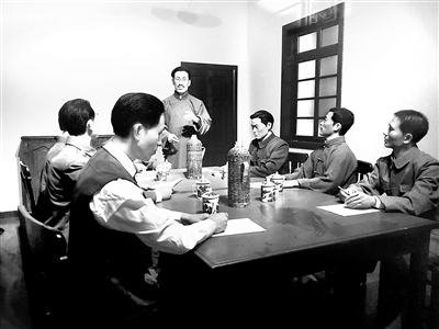 圖5:圖為1927年5月10日,中央監(jiān)察委員會(huì)成員召開會(huì)議的模擬場(chǎng)景。站立者為王荷波,其右手起逆時(shí)針依次為:楊匏安、張佐臣、劉峻山、蔡以忱、楊培森、周振聲、許白昊。蕭石月、阮嘯仙沒(méi)有參加會(huì)議。