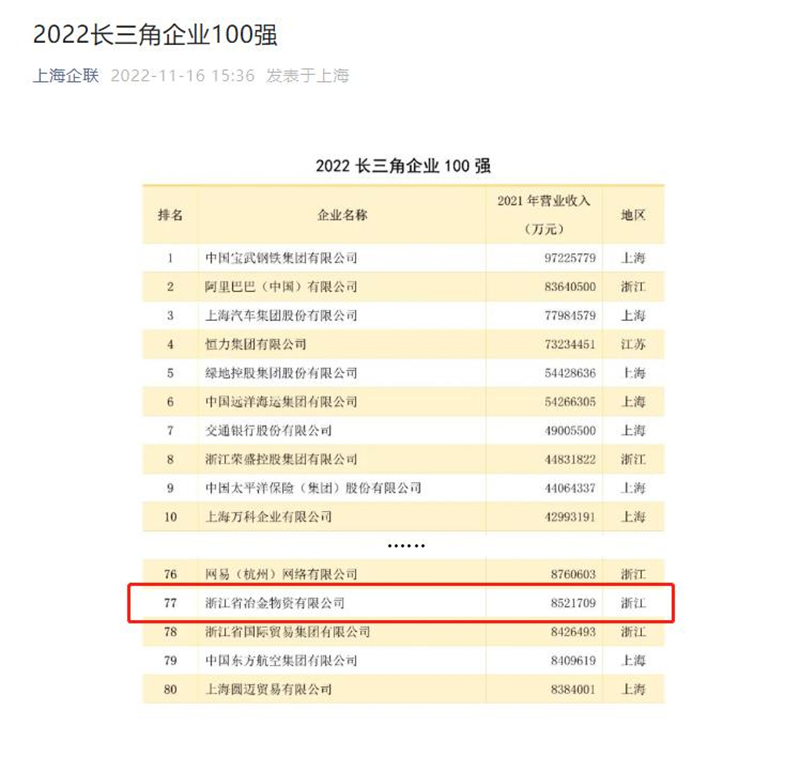 2022長三角企業百強發布,本榜單中排名前三的企業分別是中國寶武鋼鐵集團有限公司、阿里巴巴(中國)有限公司、上海汽車集團股份有限公司。浙江省冶金物資有限公司排名77位。