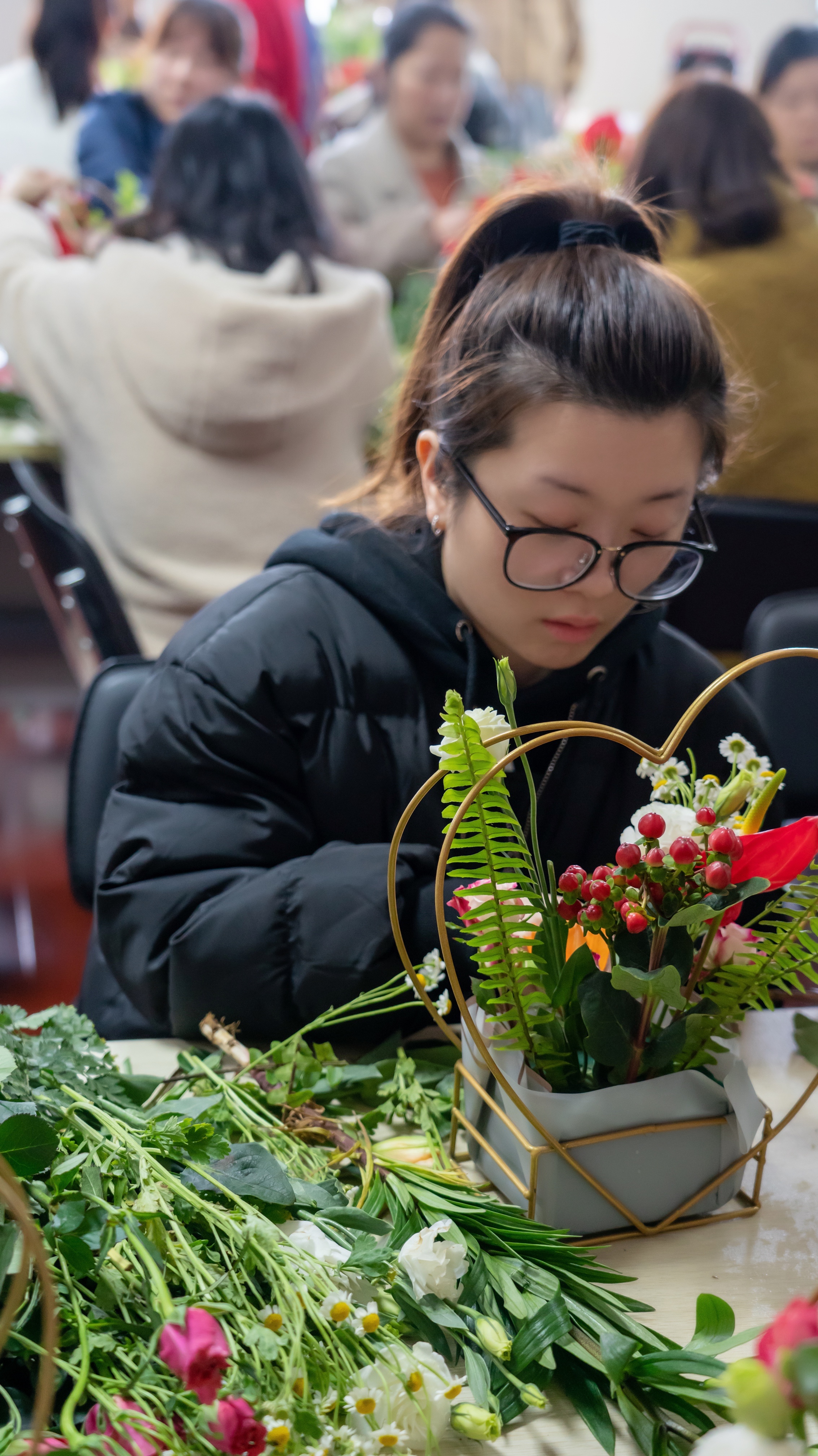 活動(dòng)現(xiàn)場(chǎng),花藝?yán)蠋煘榕毠冎v授了插花藝術(shù)的基本知識(shí)、插花造型、色彩應(yīng)用要點(diǎn)等,并現(xiàn)場(chǎng)演示插花技巧。聽著老師詳細(xì)的講解,大家邊聽邊學(xué)興致勃勃地創(chuàng)作自己的作品,忙得不亦樂乎……一束束融合了女職工們豐富想象力的插花作品展現(xiàn)在大家的面前,女職工們開心的笑容與花朵相互交融。